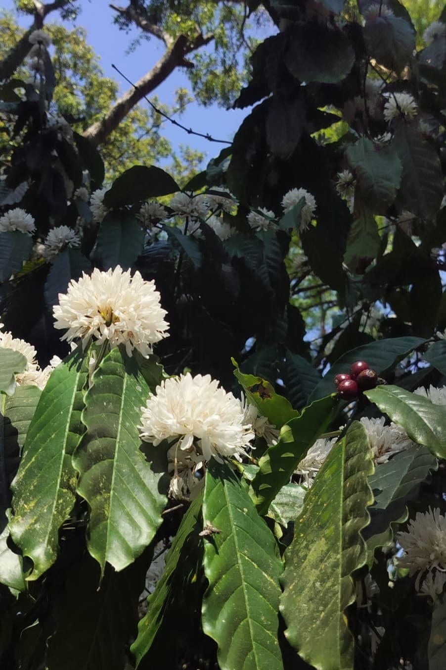 研究庄园中盛开的罗布斯塔咖啡花。图片来自Ramit Mitra
