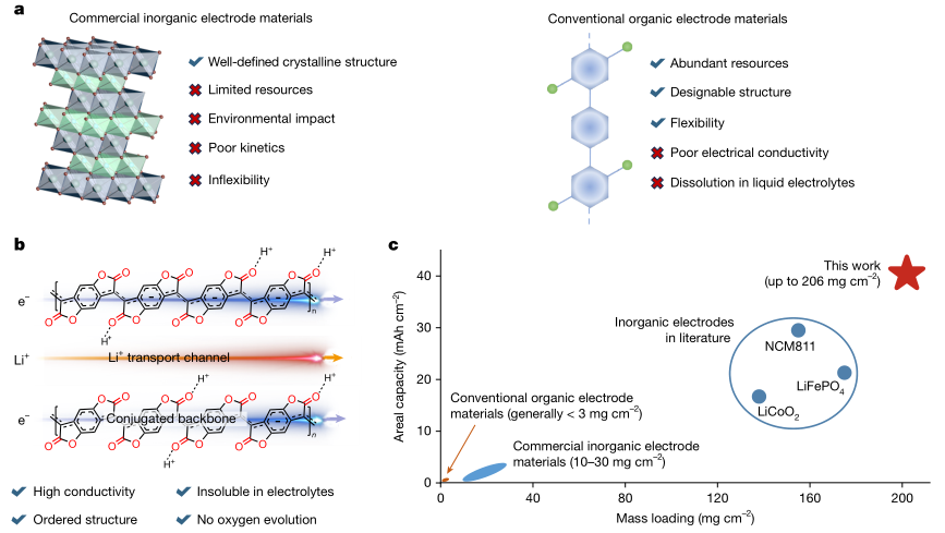 目前,主流锂电池正极材料大多使用钴、镍等无机矿物,这类材料面临资源、成本、安全及柔性不足等多重挑战。相比之下,有机电极材料取材广泛,其分子可灵活设计且自身柔韧,被视为极具潜力的“绿色电池新星”,有望重构电池产业格局。然而,这类材料一直难以兼顾高容量与大负载,导致“电量”不足或充电缓慢,严重阻碍其实用化进程。