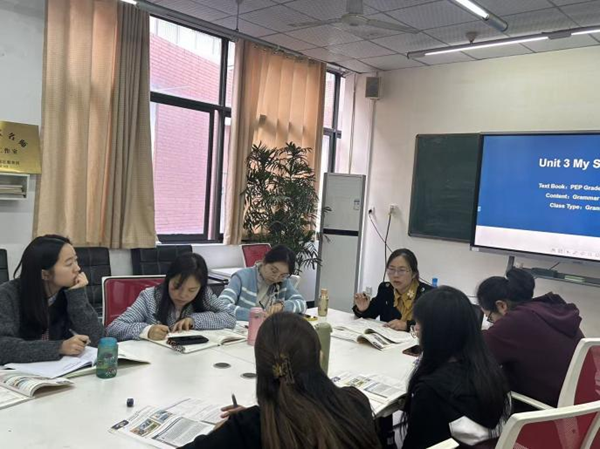 评课环节中,欧英老师结合课堂实际,重点强调两点:“第一,教师指令语言必须清晰明确,这是保证课堂效率的关键;第二,要始终重视学生语音语调、拼读等基础能力的培养,这是英语教学的根本。两位老师在这两方面都做得比较到位,值得肯定。”随后,工作室骨干教师及其他新晋教师纷纷发言,既肯定了两位教师“教学热情饱满”“细节准备精细”“基础训练扎实”等亮点,也围绕“课堂互动形式丰富性”“任务梯度优化”等方面提出了建设性建议,现场教研氛围浓厚,思维碰撞间凝聚着集体智慧。