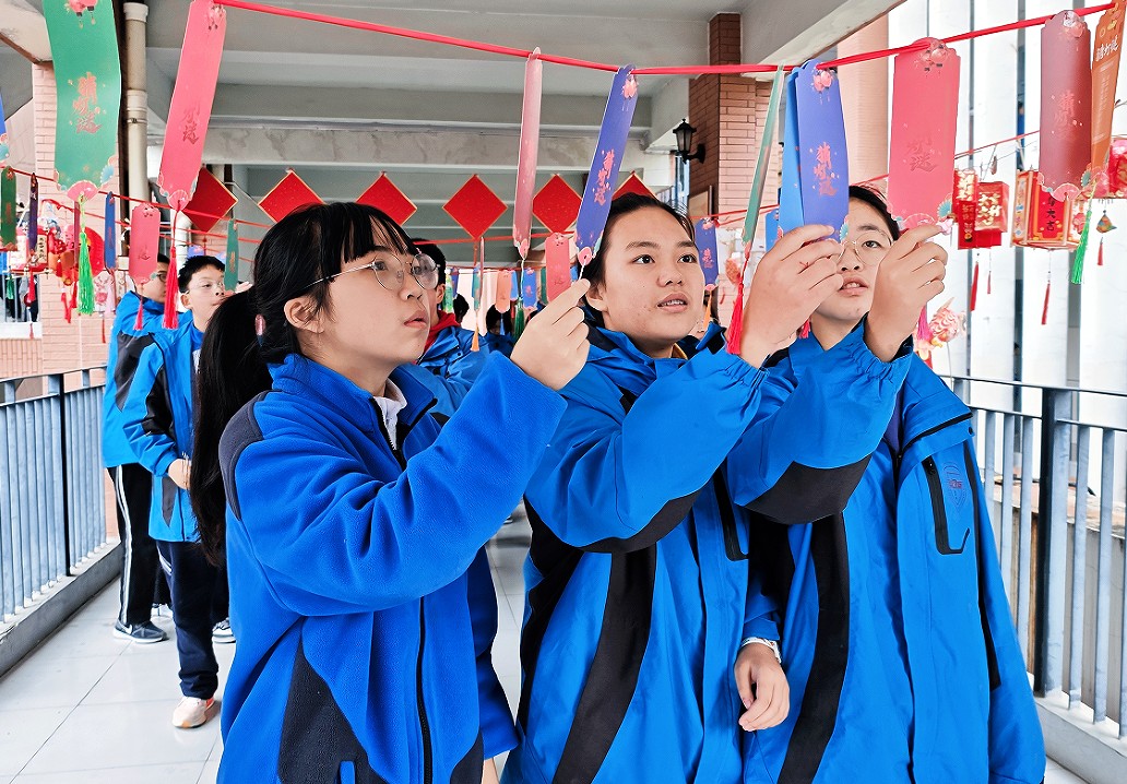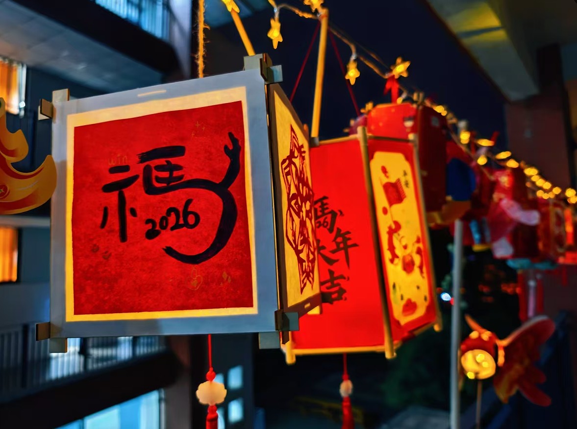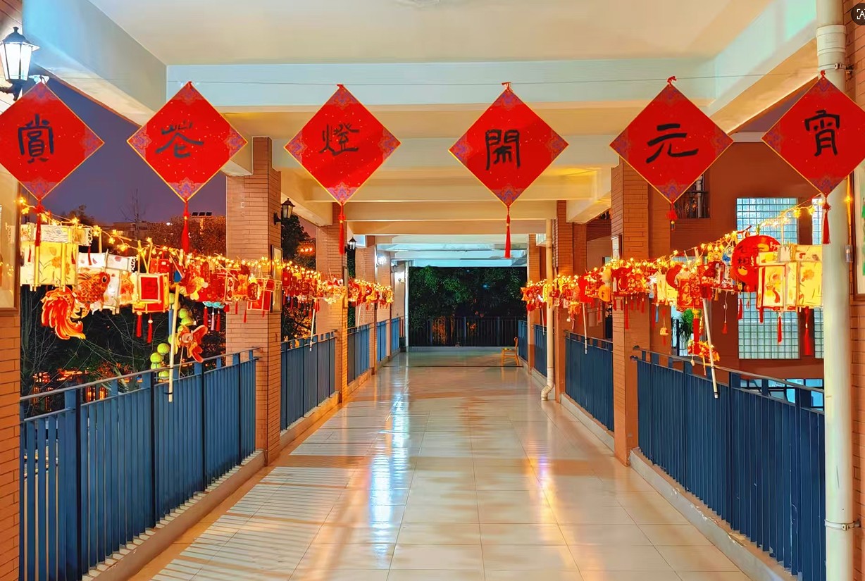 每一盏灯都凝聚着孩子们的巧思。不少灯笼内置了小彩灯,柔和的灯光透过彩纸洒落,将廊道映照得温暖而喜庆。微风吹过,灯穗轻摇,光影浮动,节日氛围扑面而来。师生们流连其间,驻足欣赏,在光影交错间感受着文字与艺术的魅力。
