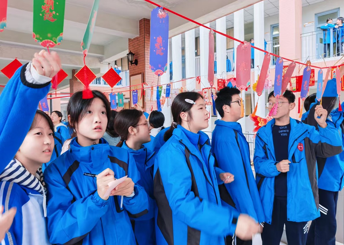 灯笼之下,一条条彩纸书写的灯谜随风轻摆,吸引着同学们驻足竞猜。谜面内容涵盖字谜、成语、诗词典故、名著人物、文学常识等多个领域,既有趣味性,又富知识性,充分体现了语文学科的积累与运用。