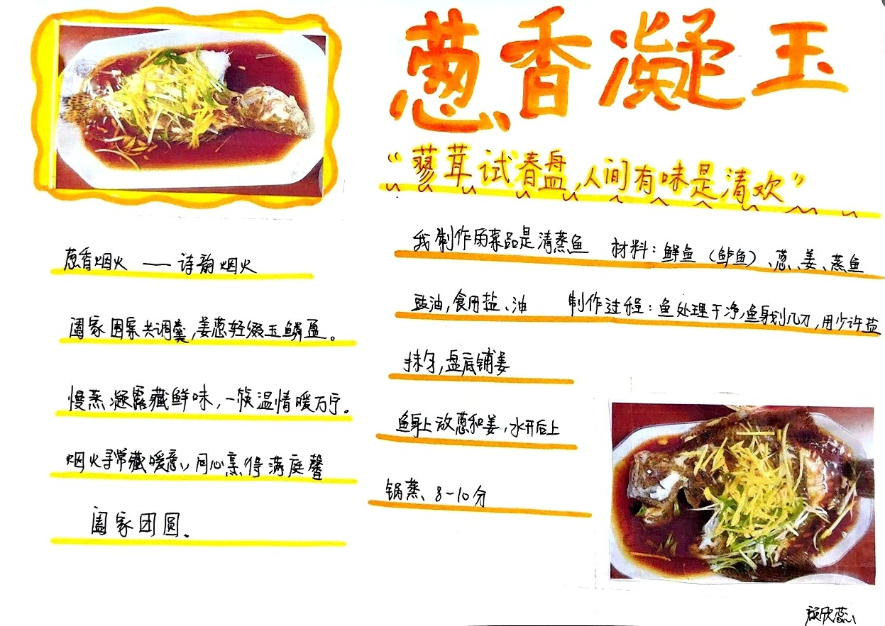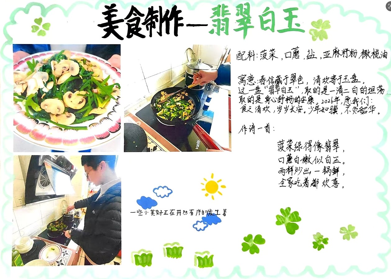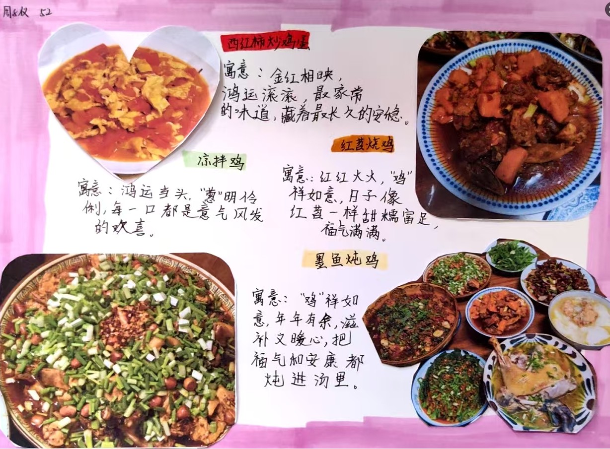作业内容丰富且紧扣学科特点:一是“灯笼制作与诗文创作”,让学生在灯笼上书写诗词对联;二是“年夜饭诗话”,为家中菜肴创作小诗;三是“春联书写与赏析”,鼓励学生书写并赏析春联。这些作业将语文学习与生活实践深度融合,让学生在动手劳作中感悟文字温度,在烟火气息里品味诗词韵味,真正实现了“生活即教育”。