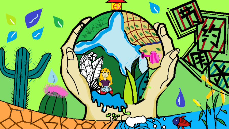 水乃万物之母、生存之本、文明之源,是人类及所有生物存在的生命资源,我们应该用实际行动来爱护地球宝贵的水资源。在本作品的创作中,绘制了一双手来托住地球的水资源,寓意着人类对水资源的爱护珍惜,地球中水资源呈现了在人类的保护下,呈现出一片生命盎然的现象,花草绿叶开放,河水江流清澈,稻田庄稼丰收,小女孩欢快幸福的劳动着,脸上充满了微笑;画面的低端呈现出爱护和破坏水资源的2钟结果对比,爱护水资源则会河水充盈、鱼儿欢游,破坏水资源地球将会变为干枯的荒地,以此警示人们应该爱护水资源。