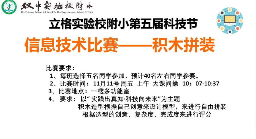 积木拼装通过趣味性的寓教于乐创意制作, 鼓励学生轻松愉快地进行应用积木拼装的知识和技能,以积木为载体,探究性学习积木拼装的搭建规则, 在动手操作中培养学生的数学思维、逻辑思维和算法思维,通过该项目活动能够培养学生的动手实践能力和创新设计能力。