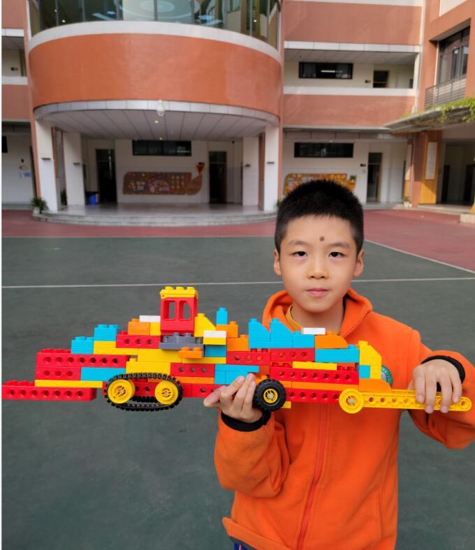 在信息技术选积木拼装修课堂中,引导学生对日常常见生活物体和造型的观察,根据生活化场景的需求分析,让学生学生使用100多颗积木进行48种造型物体的拼装,充分让学生进行动手实践和创意设想。通过一段时间的积木拼装学习,对选修课上的158名学生进行初赛选拔,让同学们自由发挥想象力,自由设计拼装积木模型,对动手能力强,有意愿参加比赛的同学进行筛选,从参与比赛的各年级各班选出80人进行比赛。在11月进行积木拼装制作阶段,教师提供材料和搭建帮助,指导参赛学生在课余时间完成自己的拼装作品原型。所有学生完成积木原型后,举行模拟赛。学生通过模拟赛,找出自己所搭建积木模型车的问题和相应改进方向。之后,学生进一步设计模型,为积木模型赋予名字和设计其独特造型。 下面请来欣赏同学们在科技节上积木创意造型吧。