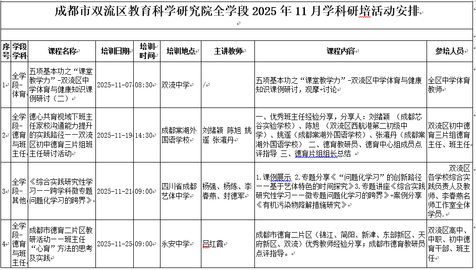 成都市双流区教育科学研究院全学段2025年11月学科研培活动安排