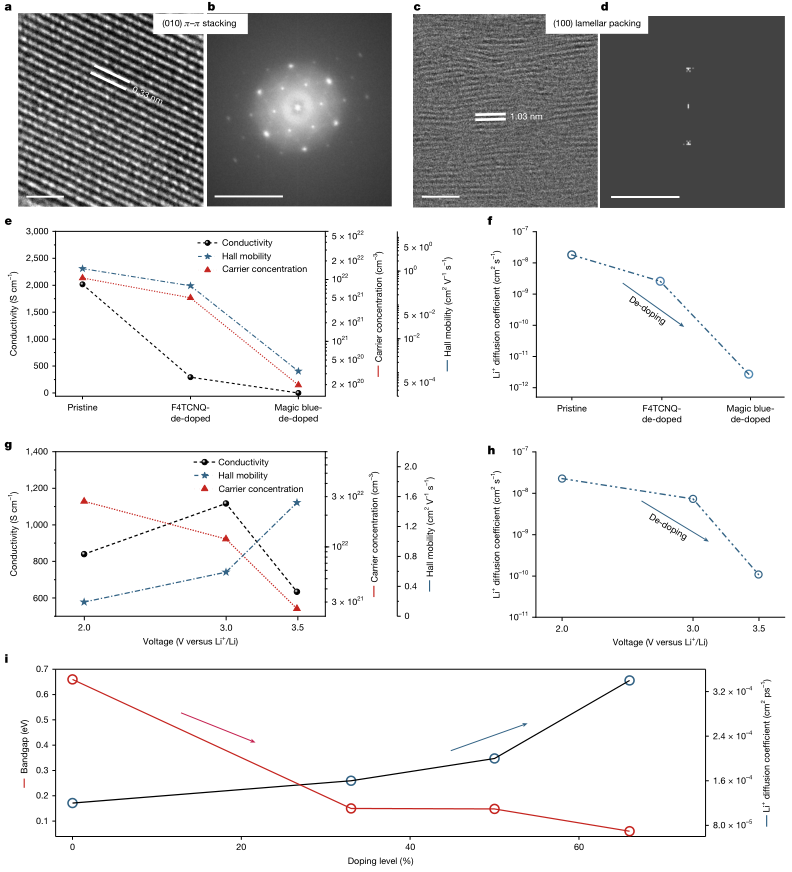 图2a展示了PBFDO的微观结构特征:该材料具有带负电荷、无侧链的平面共轭骨架,有利于形成紧密的链间堆积结构。高分辨率透射电子显微镜及低温透射电子显微镜观察结果显示,材料中存在清晰的晶格条纹,间距分别为0.33 nm和1.03 nm(图2a与2c),分别对应(010)晶面上的π-π堆叠距离以及(100)晶面上的层状堆积间距。规则排列的层状结构为锂离子传输提供了快速传输通道。研究发现较高的电子掺杂率是维持电子离子快速传输的关键(图2e和2f)。同时电池在不同工作电压下,PBFDO的电子掺杂率始终处于较高水平,电子-离子传输速率也始终处于理想状态(图2g和2h)。这一特性保证了电池在高负载电极条件下仍能保持较高的电化学活性。上述规律也进一步得到了理论计算模拟的验证(图2i)。