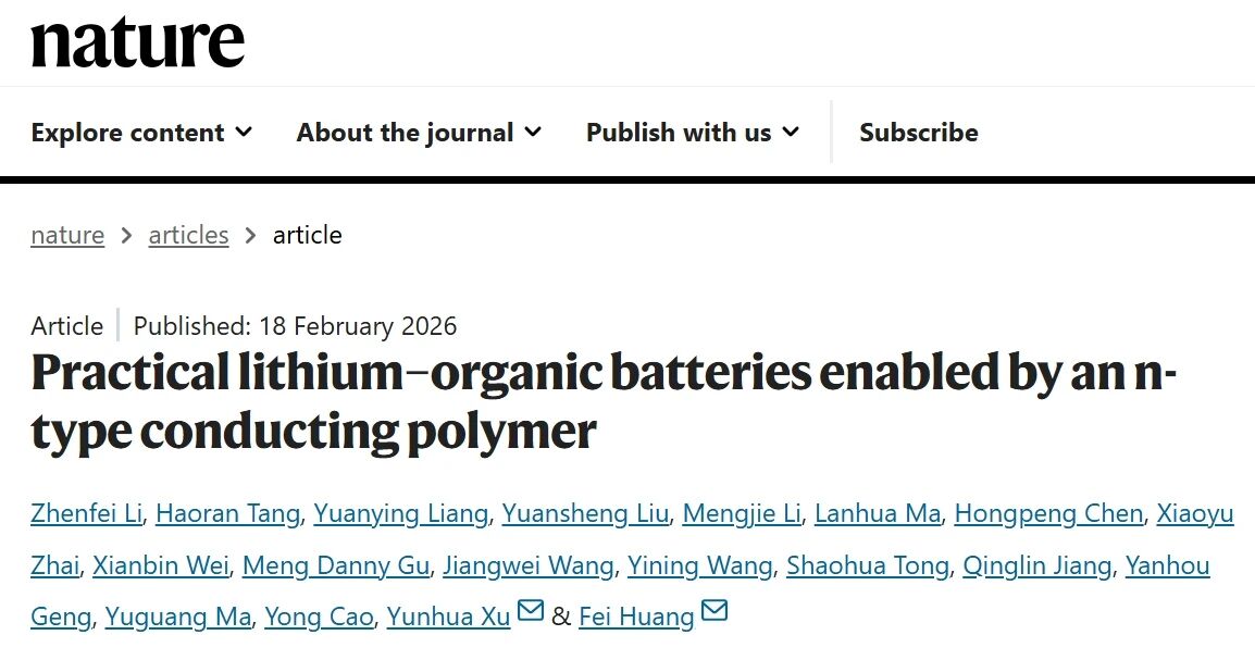 近日,天津大学材料学院许运华教授与华南理工大学发光材料与器件国家重点实验室黄飞教授等团队合作,在新型n型导电聚合物材料聚(苯并二呋喃二酮)(PBFDO)基础上,系统调控了材料中电子与锂离子的“协同传输”效率,成功开发出首款兼具优异电子导电性、锂离子快速传输能力和高储能容量的有机正极材料。2026年2月18日,该工作以“Practical Lithium-Organic Batteries Enabled by an n-Type Conducting Polymer”为题发表在Nature期刊上。文章由天津大学博士研究生李振飞与华南理工大学副教授唐浩然作为共同第一作者。