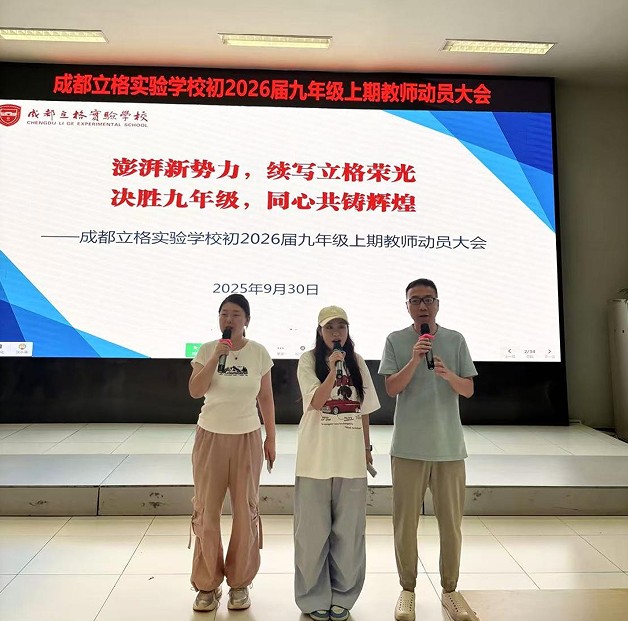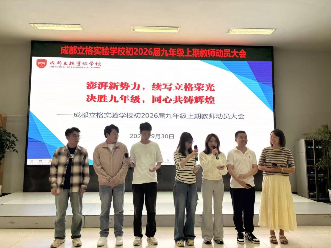 2025年9月30日,成都立格实验学校初2026届九年级教师动员大会在立格实验教育集团中学部执行校长龙清明、教育集团外事部部长兼工会主席、年级主管行政领导杨红的指导下顺利召开。原教科室主任文传福、教务处副主任本成军、行政办副主任段绪德出席会议,会议由年级副组长贺永谦主持。大会以“澎湃新势力,续写立格荣光,决胜九年级,同心共筑辉煌”为主题,旨在凝聚共识、明确目标,为中考攻坚统一思想、注入动力。