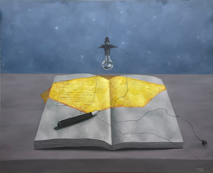 从艺术接受论的角度来看,读者一直是贯穿艺术活动的重要环节,是它构成了作者的作品完整性。现象学美学家杜夫海纳说:“观众不仅是认可作品的证人,还是以各自方式完成它的执行者。”只有当艺术作品被欣赏者以 “审美知觉” 把握时,才会转化为 “审美对象”。本次展览的特殊性在于,崔灿灿挖掘了张晓刚作为读者的一面,使得置于展厅内的读者们意识到,在张晓刚的艺术生涯中,他不仅身为作者而存在,其自身也曾是读者,也一直有着读者的一面,这两者亦可是同时存在的。
