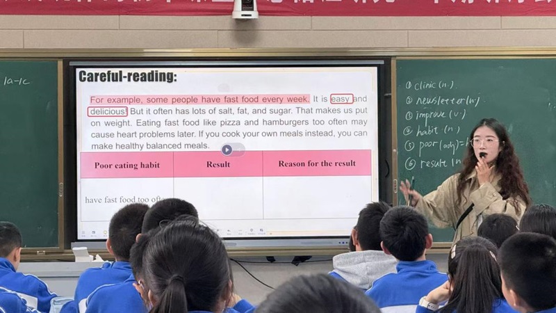 2026年4月13日,欧英名师工作室召开新教师听课评课议课活动。上午第三和第四节课,欧英老师,各年级备课组长以及部分工作室成员走近邹林宏和史洋溢老师的班级进行听课。整堂课两位老师积极的引导学生参与课堂互动,完成了七下Unit4 Eat well SectionB部分的阅读课讲授。整个教学设计流畅,各个环节过渡自然。课后当日下午,工作室成员共同研讨。对两位老师的授课进行了细致入微的点评。